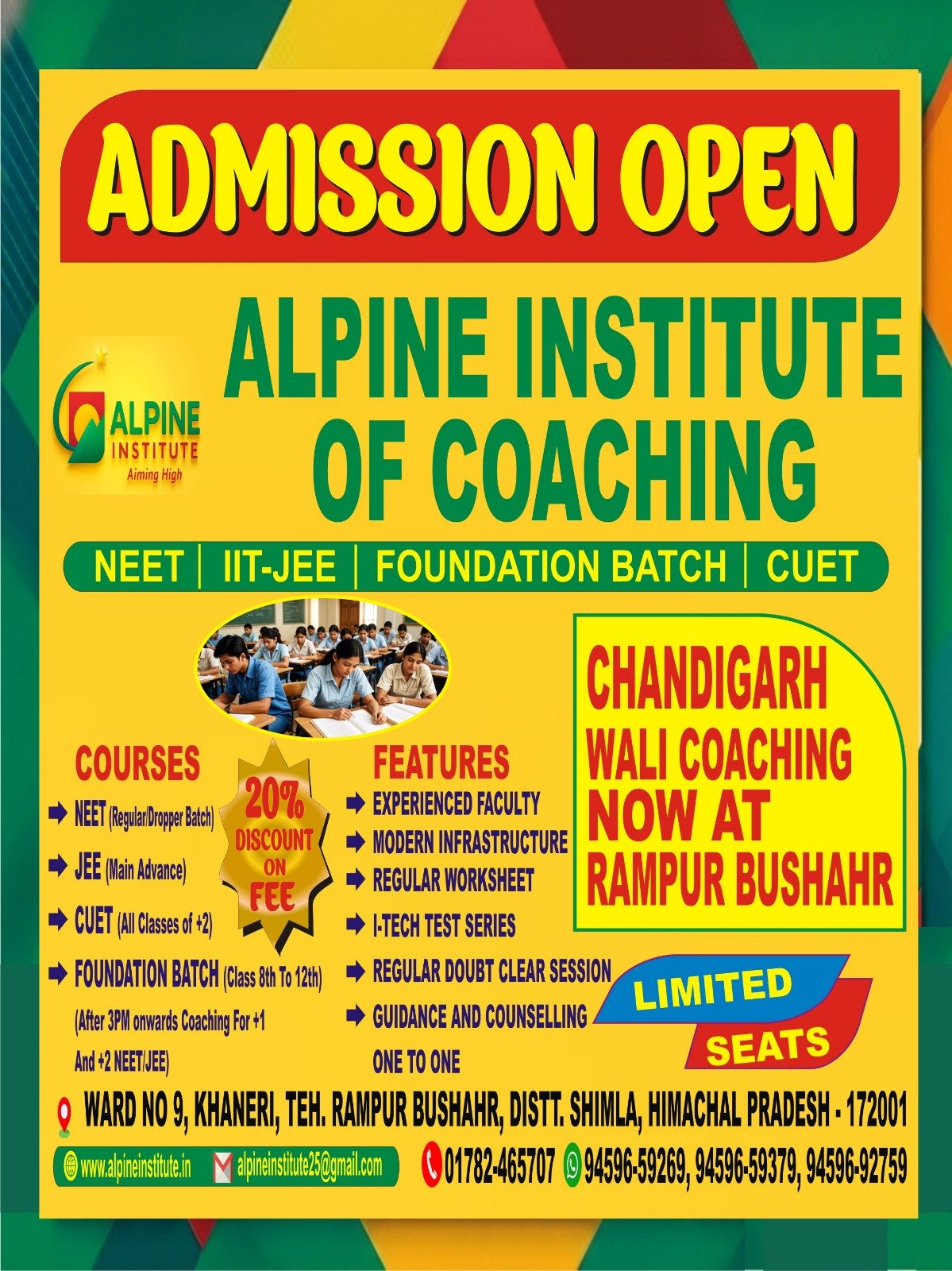 शिमला जिले के रामपुर बुशहर में Alpine Institute of Coaching ने आगामी सत्र के लिए विभिन्न प्रतियोगी परीक्षाओं के नए बैचों में दाखिले शुरू कर दिए हैं। संस्थान NEET, IIT–JEE, फाउंडेशन बैच और CUET सहित कई पाठ्यक्रमों के लिए 20% फीस छूट की सुविधा भी प्रदान कर रहा है।