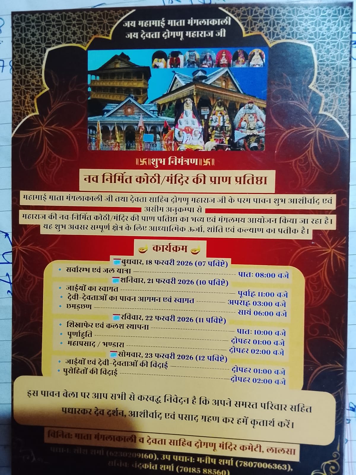 माता मंगलाकाली जी एवं देवता साहिब दोगणू महाराज जी के परम पावन आशीर्वाद से आयोजित इस धार्मिक अनुष्ठान में क्षेत्रभर के श्रद्धालुओं को आमंत्रित किया गया है।